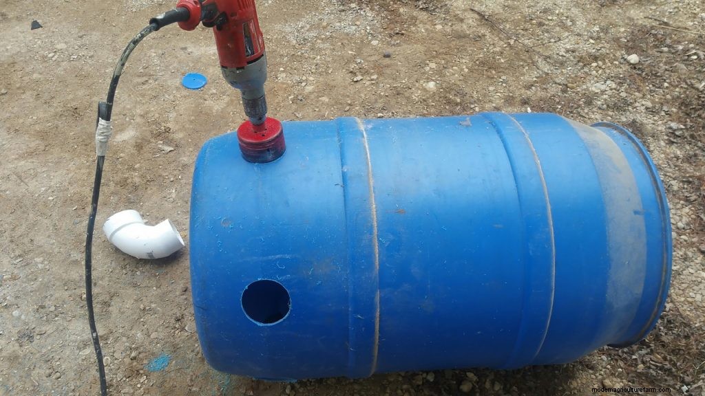 One of the plumbing supplies that I was packing up was a three-inch PVC street elbow. (A street elbow is different than a regular elbow, one side is smaller — same size as a pipe — and the other side is a fitting for a pipe to go into.) I had a hole saw that was very close to the size of the small side of the street elbow. With a regular elbow, both ends of the elbow are bigger so a pipe can slide in, but it would be harder to seal it up from the weather. I also had a spare 55-gallon food-grade plastic drum with a removable top. I pick them up when I see them for $5 to $10 each and they come in handy for many projects.