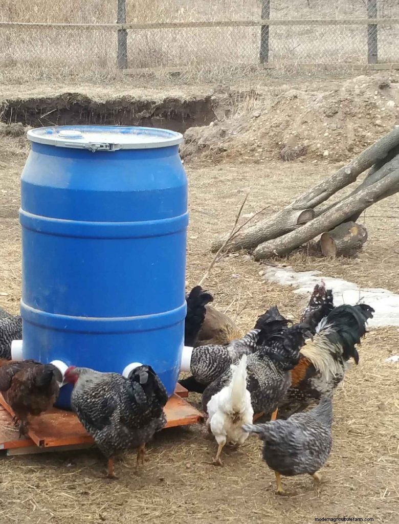 The only thing I would change is to make a cone for the middle that will direct the grain to the sides of the barrel so that chickens can get to it when the feeder gets low.