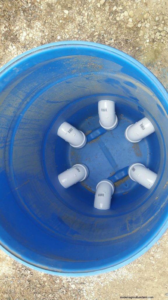On the outside, I left roughly 1.5 inches sticking out. There was a line on the elbow where it would normally fit into another pipe fitting and was used as a guideline when inserted. I wanted to seal up the elbows as much as possible, so I removed the elbows and added 100% silicone caulking around each hole. As I reinserted the elbow, I twisted it around to coat it, then placed a bead of silicone on both the outside and the inside of the barrel. It was easier to have the barrel upside down when I applied the outside silicone.