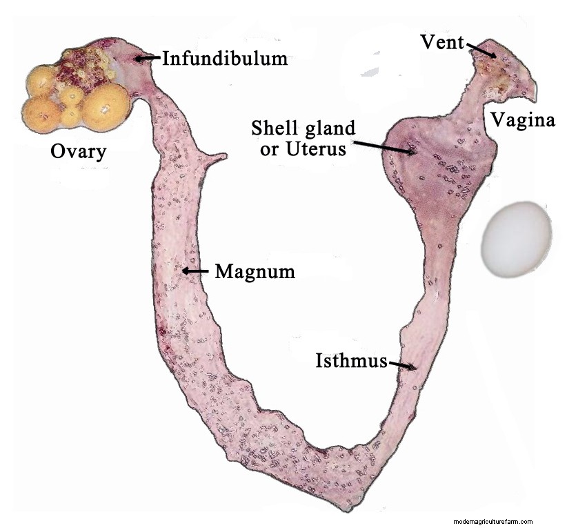 A hen doesn’t need to mate to lay eggs, but the eggs will be infertile. The hen’s reproductive system consists of the ovary (where the yolk develops) and the oviduct (where the egg is built). The oviduct is a twisted tube-like organ about 26 inches long. It’s divided into five major sections: the infundibulum, magnum, isthmus, shell gland (uterus), and vagina.