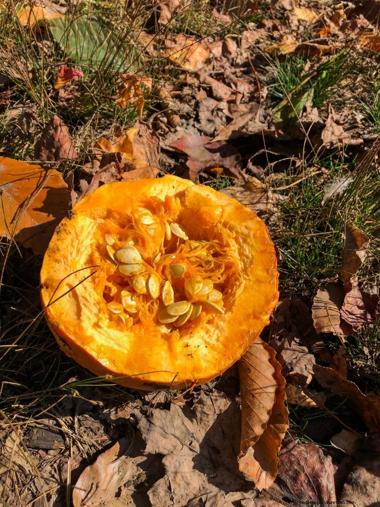 Pumpkins supply large amounts of nutrients to our chickens and livestock. The beta carotene transforms into vitamin A. Pumpkin also provides fiber, calcium, magnesium, potassium, and some of the B complex vitamins. The seeds are high in fat and calories.