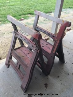 Begin by setting up your sawhorses. We used old plastic ones we had stashed away that fold flat. Plastic is great because it is easily washed afterward. You’ll have to judge placement based on the size of your sawhorses. Ours worked perfectly if set side-by-side, touching in the middle. Choose a spot outdoors, near a clean water supply, where you can spray everything down with a hose.