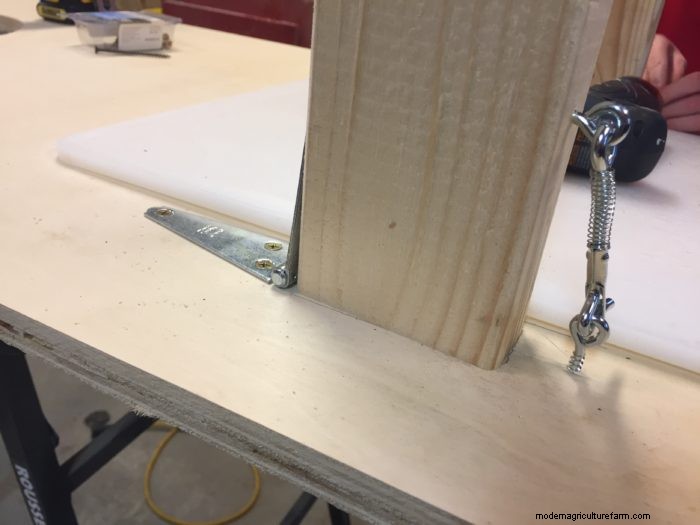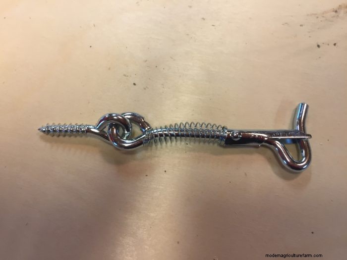 First, screw in the hook eye near the base of the 30-inch upright; eyeball-ball how far up to screw in the other side of the latch and screw it in too. It’s easier to screw those hook eyes in if you pre-drill the holes.