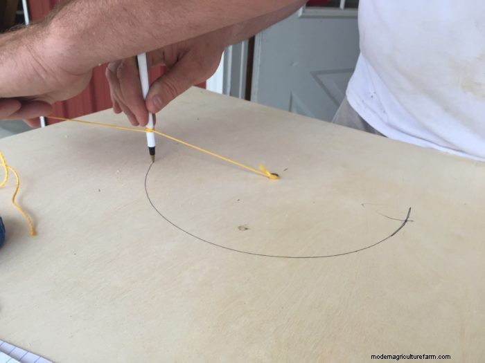 Now you are ready to make the hole for the cone on the other side of your plywood board. Measure the diameter of your cone. Ours is about 11 inches at the base. You need to cut a hole to match the diameter of the base of your cone (the widest part). You need to make a do-it-yourself version of a compass to draw your hole. First, find the center of your board left to right then measure in about eight inches from the edge, top to bottom; mark that spot. Drill a hole there and drop a nail into the spot. Make a slipknot in the end of a piece of small twine and slip it around the nail. Divide the diameter of your cone in half and measure out that far from your nail in any direction (since our cone is 11 inches wide, we measured out five-and-a-half inches). Wrap the twine around a pencil so that the tip rests on your mark. Carefully draw a circle by rotating the pencil around the nail.