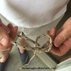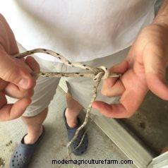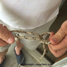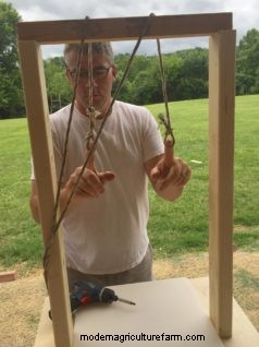 You will need a piece of rope to hang the chicken from the upright while you pluck it. We have found a simple piece of clothesline or sash cord works well. It should be about six-feet long. Tie a slip knot on each end to go around the chicken’s feet.