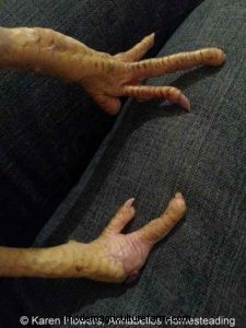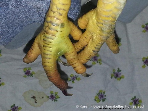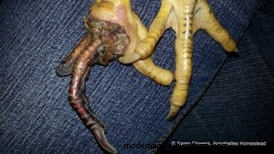 If any chickens show signs of lameness or severe frostbite of the comb or wattles, they need to be removed from the flock and treated promptly. Soak the limbs (feet, toes and legs) in room temperature Epsom salt water to gradually warm the frostbitten areas. This may take as long as a half hour of soaking. Dry thoroughly and rub bag balm or other salves on those areas. Place the bird in a carrier with bedding, food and electrolytes for chickens along with fresh water, in a warm area with no drafts. Check frequently to make certain the chicken is alert, eating and drinking normally. Examine the frostbite areas for any bleeding or infection. If there is bleeding, apply Blu Kote to prevent pecking, especially if you are treating more than one at a time. An application of Vetericyn will help prevent infection.