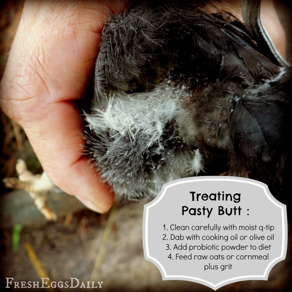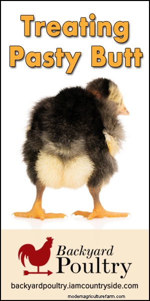 Pasty Butt is a condition in which feces get stuck in the baby chick’s vent and literally stop up the chick so it can’t excrete its poop. It can kill the chick fairly quickly if not treated immediately, so knowing how to treat this condition is an important part of caring for baby chicks.