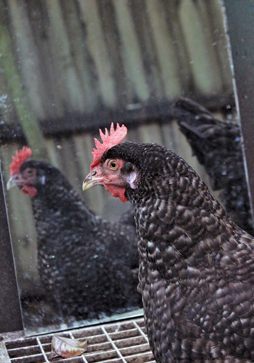 Another free item that I found that poultry use often is a mirror, which are great toys for chickens. Whether it is a goose, duck or chicken, if there is a mirror on or near the ground, they are looking into it. I have several mirrors throughout my gardens that my poultry visit on a daily basis. Friends have given me old mirrors and I have found them on social media sites for free. Mirrors may help small flocks feel more comfortable. Whatever the reason, my birds look at themselves often.