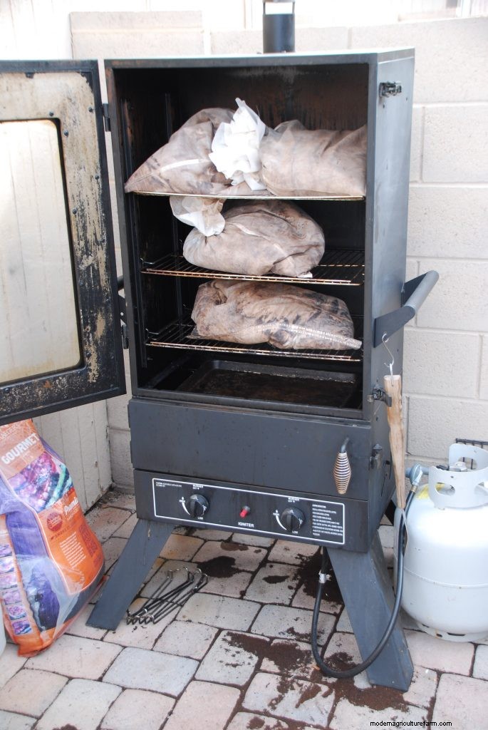 However, once you have these wet grounds, they will need to be dried. Damp grounds left alone will soon become moldy, forming uninviting green clumps. Depending on your local climate, you could set the nylon bags out in the sun on a dark surface to dry, with an occasional flipping and rearranging of grounds inside, or use some heat source to dry them. After many experiments in bone-dry high Arizona desert — including filling the house with coffee smells from the kitchen oven! I found a perfect solution for us: I picked up a used, large, standing propane-fired smoker for smoking meats and cheeses. (These normally retail for $300-700 unassembled; I found mine fully assembled for sale on Craigslist for a mere $30 from a Hawaiian BBQ hobbyist upgrading to a larger model!) I originally bought it for smoking an occasional batch of ribs, fish, or briskets, but it quickly became our coffee grounds dehydrator almost exclusively! Electric smokers also exist and are usually thermostatically controlled. One could also try drying in a pan in an enclosed gas barbeque grill, but it will be hard to maintain a proper temperature.