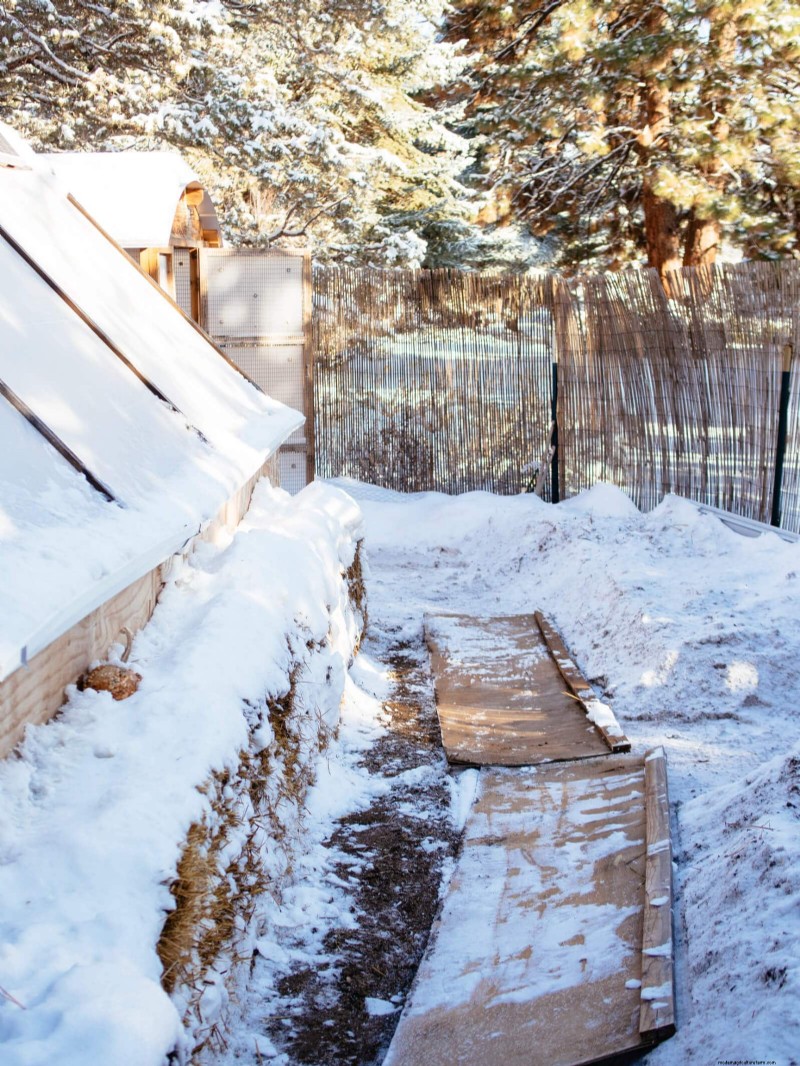 After a decent storm, we try to clear a path through the yard as soon as we can so the chickens aren’t confined to their coop. We also spread wooden planks and branches throughout the yard for them to perch on and get out of the snow.