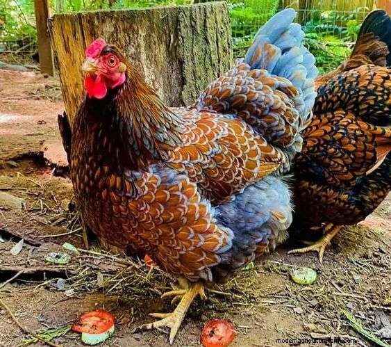 It is complex to get the right coloring of the Blue Laced Red Wyandotte chickens. The red base coating has to come from a bird with mahogany red coloring, created from yellow-red pheomelanin and red enhancing genes.