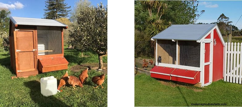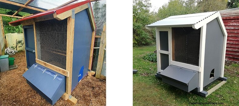 The 3rd chicken coop has a nice warm looking wood stain such as Resene Woodsman Heartwood. The photo above left is a 2 bay chicken coop painted red with contrasting white framing.