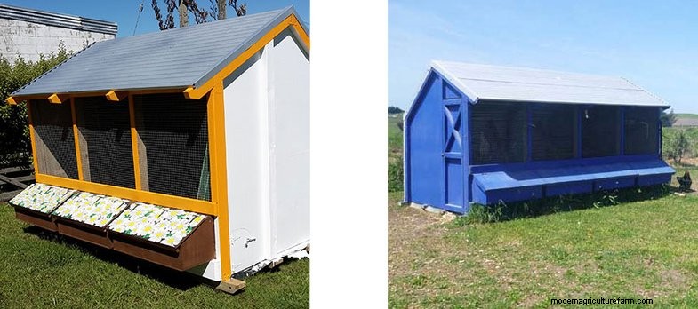Above left is a 3 bay chicken coop that has beautiful flowers painted onto the tops of the nest boxes with orange timber framing and white walls. The photo on the right is a 4 bay chicken coop that is painted bright blue with the inside also painted but in light grey.