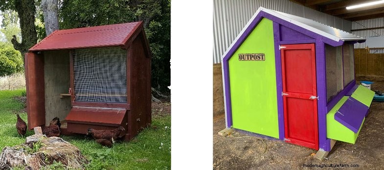 The 1 bay chicken coop above left has a Scoria Red Colorsteel roof with matching paint. The photo above right is a 2 bay chicken coop that has the most colourful paint job we’ve seen!