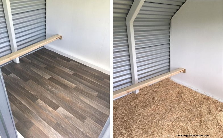 In the picture above you can see on the left side the clean timber board floor and on the right it has been covered with wood chip bedding that absorbs the poop. These pictures are both of the inside of an Outpost 4 Bay Hen House.