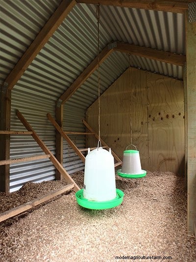 There is a pellet feeder and water font hanging from the roof framing inside the hen house. Hanging them like this helps to keep the water & food clean and miminises waste as the hens don’t stand in it or bump it over. To do this you can simply screw a steel hook into the strong timber framing on an Outpost Hen House.