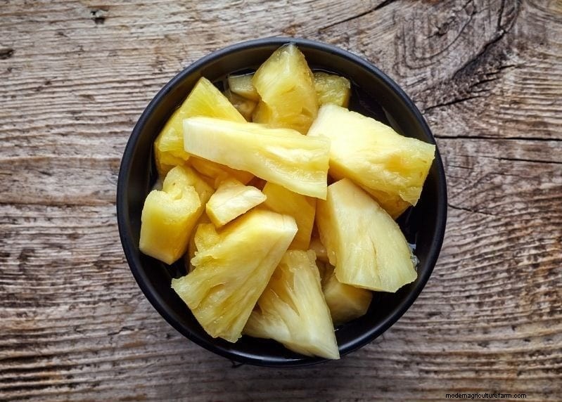 Since pineapple is juicy, it’s not recommended that you mix in fresh fruit with anything that could get saturated and mushy, such as layering pellets or chicken feed. If you want to mix the fresh pineapple with other foods, use other safe fruits and vegetables.