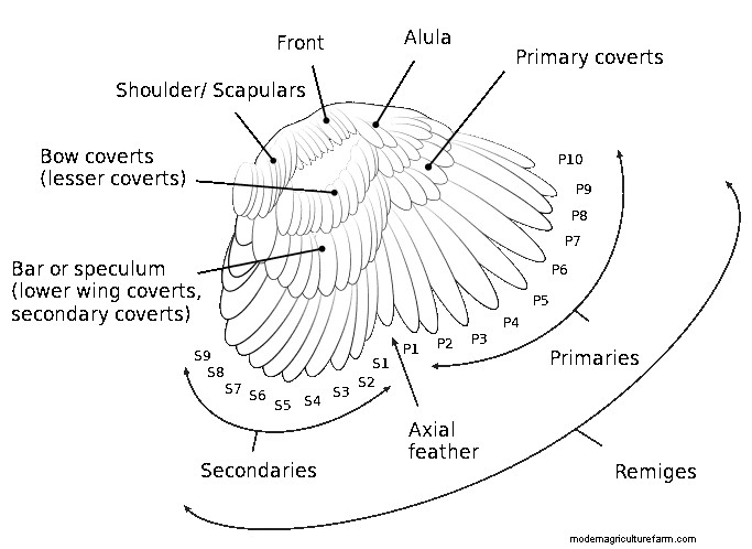 Chickens, be they rooster or hen, have flight feathers. An axial feather separates the primary feathers from the secondary ones. When a chicken molts, they lose the feathers from the axial outward.