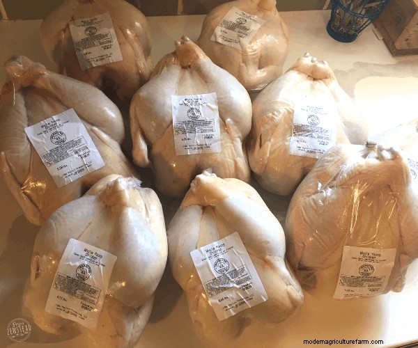 We took our meat chickens to a local butcher to have them processed. We decided to have them professionally processed because a butcher is able to do a much better job than we can at home. It also saves us a day’s worth of work. And, it only cost $5 per bird to have them processed! Totally worth it to not have to do the plucking myself! The butcher will even do custom cuts and save parts (like feet, organs, etc) and give them back to you if you want them.