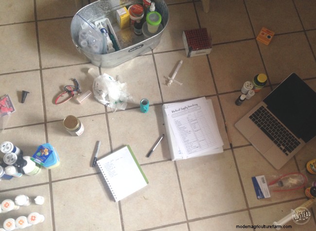 In order to compile our first aid kits, I gathered the medical supplies that we had on hand and started organizing them. I marked down our on-hand supplies on the Medical Supply Inventory lists in my 2018 Homestead Management Binder (get yours here!). I made one inventory list for our chickens, one for the goats and one for our goat kidding supplies.