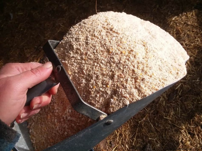 Before we had the grinder we would buy all the ingredients separately from the feed mill, weigh it out on small food scales we bought in town and mix it in 100 pound batches in the wheelbarrow.