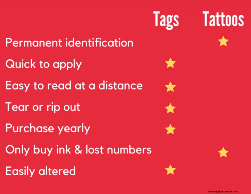 Putting in both tags and tattoos would give you the best of both worlds: a permanent method of identifying your animals with the ease of just looking at the animal to get the information.