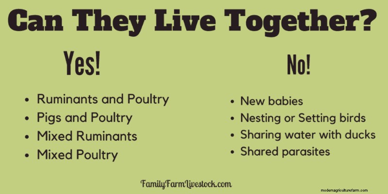 Farm animals that can be successfully raised together are ruminants (cattle, sheep, goats) and poultry, pigs and poultry, mixed ruminants and mixed poultry.