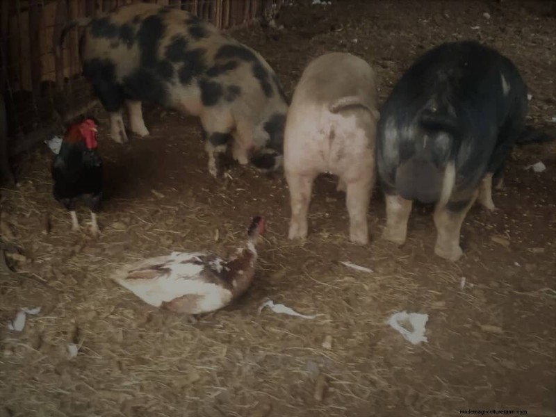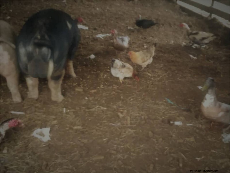 Pigs and chickens, ducks, guineas and/or geese can be raised together as long as the poultry are mature, have their own water and are able to enter and exit the pig area freely.