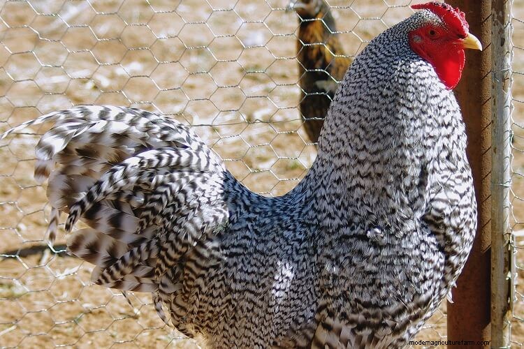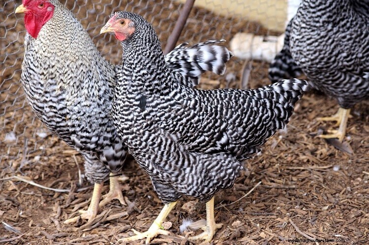 These chickens have thin black and white bars on their feathers – there are no other color varieties for this breed.