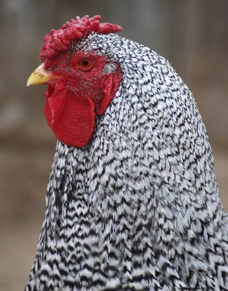 Another way to tell the Dominique and Plymouth Rock apart is their barred pattern – however this is more difficult to spot. The Plymouth Rock’s barred patterning is very crisp and true black/white while the Dominique has a more jagged pattern with less contrast between the black and white colors.