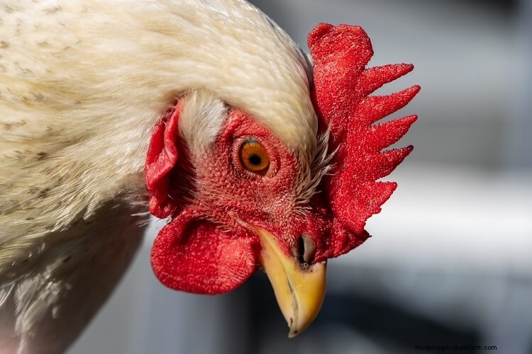 The comb, wattles and ear lobes are all red and their beak is a yellow or horn color.