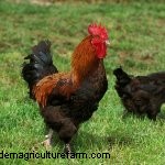 Black Copper Marans: The roosters look quite stunning in their full plumage. They have copper colored hackles and saddle feathers over a black base which has a green iridescence in sunlight. Hens have some coppery highlights in their neck feathering but are much more subdued overall. Not so long age this color was all the rage. People wanted them in their flocks for the deep coloring of the eggs.