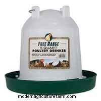 Consider the size of the flock and buy an appropriate sized waterer for them. The average chicken will drink about one pint (473ml) of water a day. So if you have a flock of six chickens you will need a waterer that holds at least six pints.