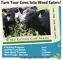 I put what I learned in a book, Cows Eat Weeds, and a DVD called Teaching Cows to Eat Weeds so that any farmer or rancher who wanted to could do the simple steps to turn his problem weeds into forage. (Get the first three chapters of the book free by signing up for my newsletter.) Here are the basics of what you’ll find: