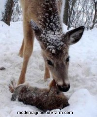 This isn’t the only instance of supposed vegetarians eating meat. There are bird-eating sheep in the Shetland islands. In the U.S. the miniature video cameras biologists use to monitor nests are revealing that weasels, mice, ground squirrels, and white tail deer eat both eggs and birds. Canadian bird researchers capturing songbirds in mist nets were astonished to see deer eating the birds right out of the nets.