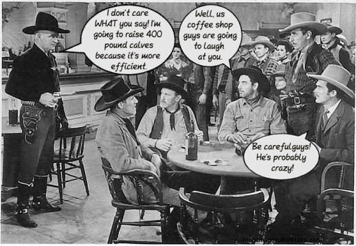What I am getting at is that it is nearly impossible to improve the efficiency of a cow living in a near natural environment raising a 400 pound calf. This brings up the problem of how many cattlemen can go this route? First they will say I’m crazy. Then they’ll say it might work in Eastern Colorado, but not where I live. Then there may be some that understand, but won’t be able to handle the abuse of their coffee shop friends.