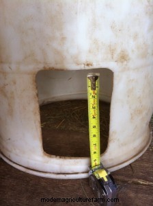 The fourth and final step is cutting the hole for the kids. Over the years I’ve experimented with various sized holes and have found that a 9″ x 7″ opening works the best. Any bigger and you run the risk of the mommas getting more than just their heads through the barrel when looking for their young. I’ve had to cut a few of them out who have wiggled in past their shoulder becoming tight, but with this sized hole it accommodates the young while keeping the adults out. To cut the hole, measure and outline the hole using a Sharpie marker or some other type of permanent pen. Do not cut the bottom of the barrel. Keep a lip on the barrel for stability and to prevent sharp edges. Make a pilot hole using the drill and then with either a jig or reciprocating saw, cut around the outline to create a hole, rounding at the corners.
