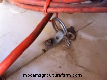 Third, you will need to install a bracket and ring. While many people often skip this step, chances are they come back and install it after finding their warming barrel tipped over and pulled from the socket rendering it useless. Keep in mind, these are farm animals we’re dealing with and they will find every way possible to mess with your equipment. I use a simple four-hole strap that I bend over a piece of pipe for a space under which I attach a metal ring. Forget the baling twine. Forget the rope. We’re talking livestock-tough. Trust me on this one. Again, using the drill, make two holes and attache the bracket and ring to the top of the barrel using the bolts, nuts and washers.