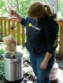 Meanwhile, our not inexpensive turkey fryer, which has never yet been used to fry a turkey, is heating up a big pot of water. When the chicken was truly dead, we chopped off it’s head and dropped it in the blood collection bucket just below the killing cone. To pluck a chicken you have to dunk it in 200 degree water for about 15 seconds to loosen the feathers up. This enhances their natural aroma. Then you plop them on top of the plastic covered grill (the sideburner makes a great plucking table when closed) and yank out all the feathers. The big tail and wing feathers are the hardest to pull and the little fine feathers are the most tedious to finish off. If you’re fast, this takes 10 minutes. We were not fast the first year.