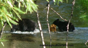 We butchered our first 7 chickens on a Monday and left the rest for the following Friday. Tuesday it looked like something had been prowling around the chicken tractor, and something had even reached in and nabbed a chicken, so we threw an old trellis on the roof and added extra bricks around the bottom. Wednesday morning, all was fine. Wednesday afternoon, it looked like a glimpse of the apocalypse had happened in our back yard. It appeared a bomb had exploded the chicken coop; the roof was ripped off, there was blood and chicken carcasses all over, and there were very scared, traumatized chickens left in the pen. We moved the remaining chickens up to the hen house with our egg layers. While in the process of calling the Division of Wildlife, the very happy bear returned to check out the murder scene. We chased it off and promptly put an electric fence around the chicken tractor. We left a dead chicken inside the pen to encourage the bear to come back and test the fence. I checked the fence at 11:00 p.m. when I heard a scream. It was a scary walk, but I was glad to see that the fence was still up, and the bear had probably learned about electricity.