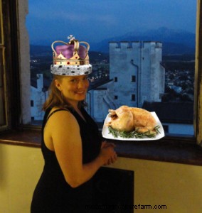 Now the chicken looks like what you would buy in the store (if you’d been smart enough to buy them in the first place). We are very proud of ourselves and manage to get 7 done in one day. Then we cleaned up the bloody plastic, the disgusting turkey fryer, and the killing cone and blood buckets, and ourselves. Our hands always smell like weird, dead, teenage chickens after a day of slaughter.