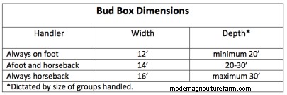 Most cow-calf operations will need a Box that is at least 12 feet wide and 20 feet deep. It can be 14 feet wide and should be if the handler will be horseback. Depending on the size of the cattle being worked it could be 16 feet wide if the handler in the Box will always be horseback. Both the 14 and 16 foot widths are too wide for comfortably working most stock on foot.