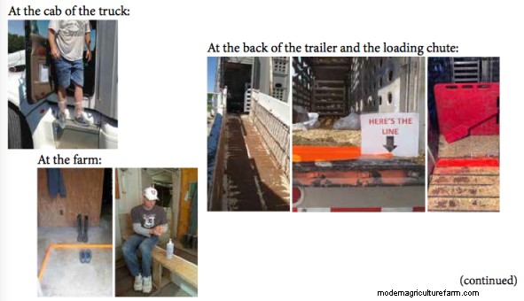 Diseases like to hitch a ride so approach every contact with a site or market as if it could contaminate your truck, trailer, equipment, boots and other clothing. Shavings and manure, or water, mud or snow can carry diseases on boots, clothing ,tires, undercarriages, trailers, shovels, winter panels, sorting panels and people’s clothes and all infect healthy pigs. Establish lines of separation between the areas that are used by transporters and the areas to be used by frame or market personnel. Here are examples of lines of separation: