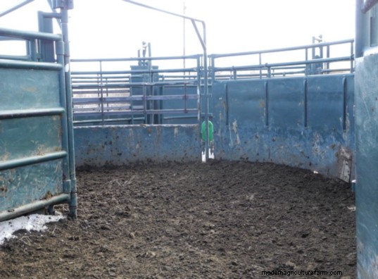 As argued above, from a cow’s eye view (see photo below) entering a tub is like running into a wall which often results in cattle slowing, stopping, and wanting to turn back. Feeling the pressure of the enclosed tub, cattle often do want to go back where they came from, as Grandin claims, but it’s not around the 180-degree corner, it’s back around or over the top of the handler!