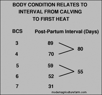 Body condition score (BCS) of beef cows at the time of calving has the greatest impact on subsequent rebreeding performance (Table 1). The postpartum interval is the length of time from calving to first estrus (heat) after calving. For a cow to maintain a 365 day calving interval, she must rebreed by 82 days after calving (283 day gestation + 82 day postpartum interval = 365 days). On the average, cows that calve in a BCS 3 or 4 have difficulty exhibiting their first heat by 80 days after calving. Whereas cows that calve in BCS 5 or 6 tend to exhibit heat by 55 days after calving and; therefore, have a better opportunity to maintain a 365 day calving interval. Although cows that calve in a BCS of 7 have a short postpartum interval, it is not economical to feed cows to a condition score of 7.