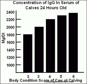 Body condition of March calving cows can be related to quality of colostrum produced at calving and the amount of immunoglobulin in the blood stream of the calf by 24 hours after calving. Calves from dams that calve in a body condition score of 5 have more immunoglobulin in their blood stream by 24 hours after birth as compared to calves from cows that calve in a lower body condition score. In addition, March calving mature cows that calve in a body condition score of 5 have a shorter interval from calving to their first estrus after calving compared to cows that calve in a lower body condition score. Thin cows at calving (BCS 4 or thinner) produce less colostrum, give birth to less vigorous calves that are slower to stand and these calves have lower immunoglobulin levels (Figure 1), thus impairing their ability to overcome early calf-hood disease challenges. This illustrates the importance of targeting mature cows to calve in a BCS of at least 5. Because 1st-calf-heifers have only reached about 85% of their mature weight after calving and require additional nutrients to support growth, they need to be fed so they are a BCS of 6 at calving.