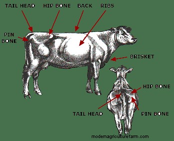 Body condition scoring can be done using only visual indicators or a combination of visual and palpation of key bone structures for fat cover. Palpation can be done during routine processing of cows through a chute. The key areas for evaluation are the backbone, ribs, hips, pinbones, tailhead, and brisket. Palpating cows for fatness along the backbone, ribs, and tailhead will help refine your skill to visually access body condition.