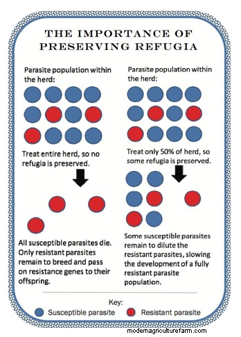 Any time you treat your livestock with an antiparasitic, there are a few in the bunch that just don’t succumb. They become the potential foundation of an entire resistant population of parasites. Their offspring inherit the resistance gene, they send the resistance on to the next generation, and so on and so on. BUT, if you keep non-resistant parasites in the mix, they dilute the resistant parasites, slowing the development of a fully resistant population.