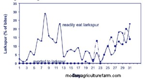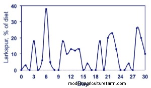 While most toxins produce food aversions, many plants high in toxins are also nutritious. Intake of a nutritious food that also contains toxins tends to be cyclical. Animals increase intake of a nutritious, toxic food until they experience illness from the toxin in the food and then they decrease intake of the food. After the animal recovers from illness it again increases intake due to the feedback from the nutrients in the food and the cycle repeats. Unfortunately, sometimes they eat too much and die. To the right is a graph of larkspur intake by a single cow over 30 days (Pfister et al., 1997).