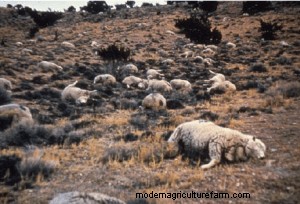 Thirsty animals often have no appetite. If high densities of poisonous plants grow near watering points, once thirsty animals drink they may over ingest poisonous plants while waiting for the rest of the herd or flock to water. Normally, if animals have a choice between eating a toxic food or starving, in most cases they’ll eat toxic plants. Animals need to have nutritious alternatives when toxic plants are present. For example in 1971, 1250 sheep from died from over-ingestion of halogen. Sheep had limited supplies of water and were hungry; as a result sheep ate 10 times the amount of halogeton to cause death (Figure 3) (EPA, 1971). Sheep can incorporate some halogeton in their diet without adverse effects, provided halogen is added to their diet slowly to let the rumen to adapt to the oxalates in halogeton and sheep eat halogeton along with other plants (James and Cronin, 1974).